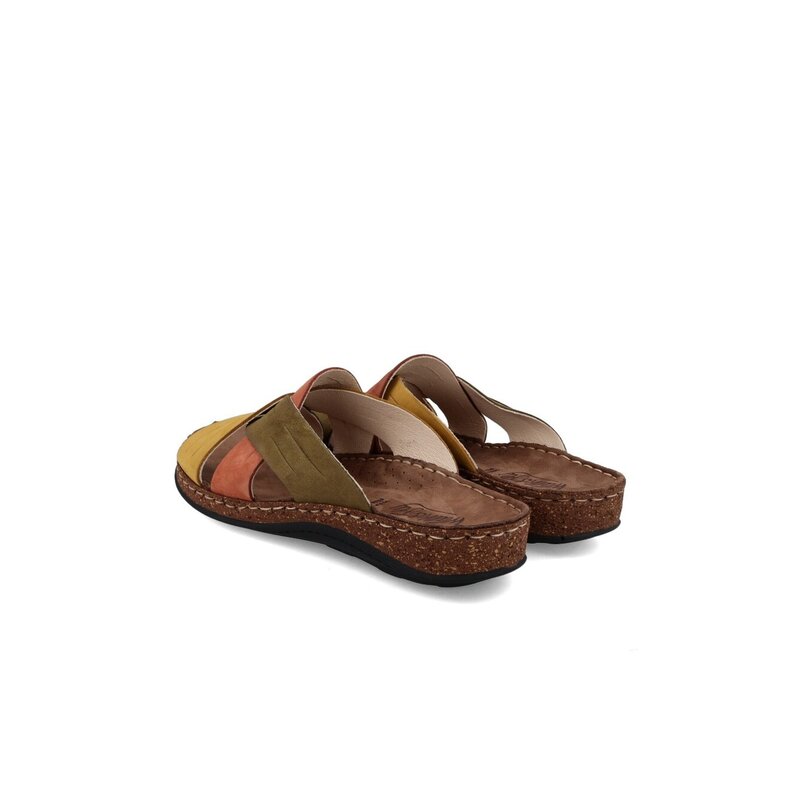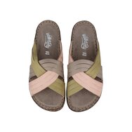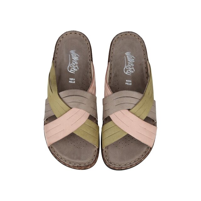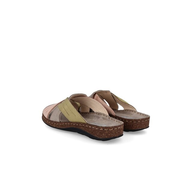 Discover the unparalleled comfort and cheerful style of the Slide Sandals Walk & Fly Knokke 3861 45330 A5. Made from soft cowhide leather in a vibrant combination of taupe, green, and pink, these slip-on design sandals will provide you with an unmatched feeling of well-being for your summer days.