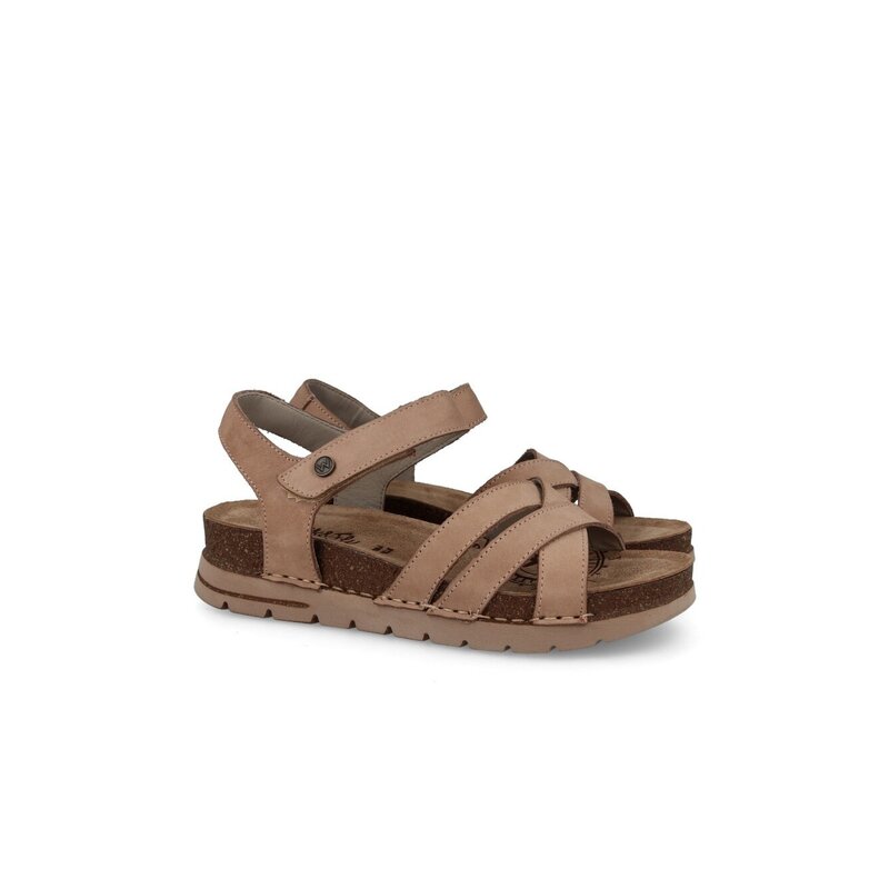 Sandalias tiras Walk & Fly Mediterraneo 3861 43170 para mujer en combinación de colores burdeos, teja, marrón y taupe. Característincas: cierre de velcro, altura de la cuña de 3 cm, zapato de estilo casual, suela de goma termoplástica con parte superior fabricado con corcho reutilizado, material exterior piel y plantilla de piel acolchada.