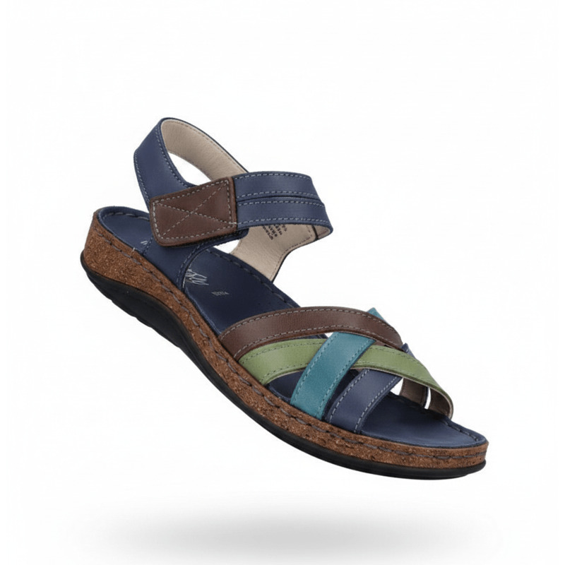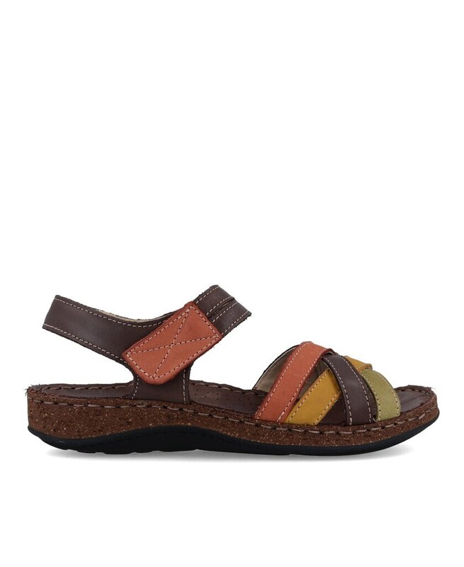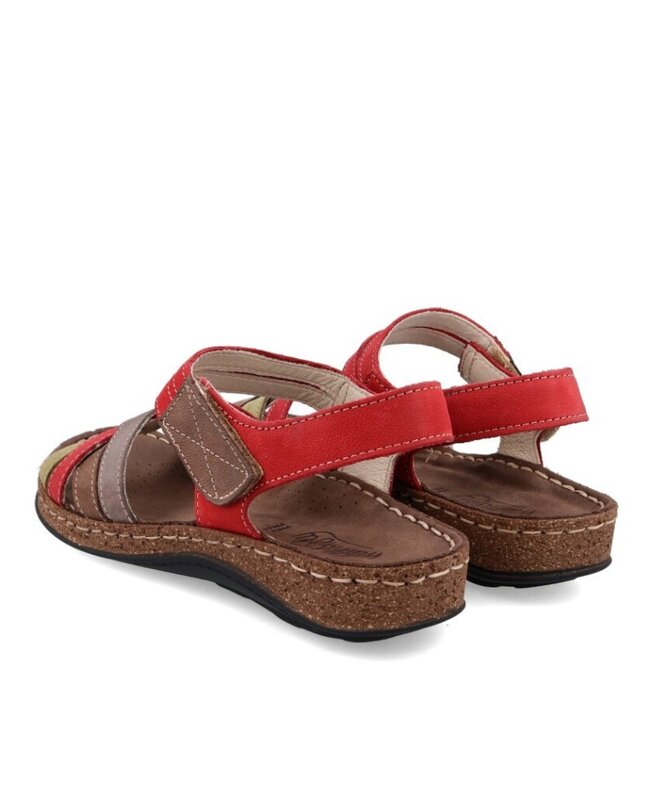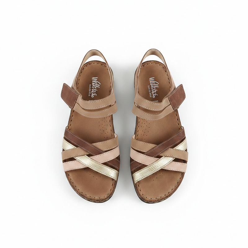 Sandalias Walk & Fly Mediterraneo 3861 43170 en color kaki, con velcro, sandalias casual con cuña media de 3 cm de altura, suela de poliuretano, material exterior piel vacuna, forro interior de piel suave y plantilla acolchada de piel cosida a mano a la suela.